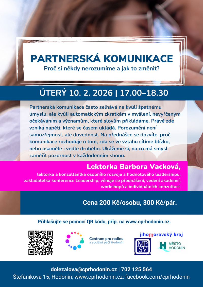 Partnerská komunikace často selhává ne kvůli špatnému úmyslu, ale kvůli automatickým zkratkám v myšlení, nevyřčeným očekáváním a významům, které slovům přikládáme. Právě zde vzniká napětí, které se časem ukládá. Porozumění není samozřejmost, ale dovednost. Dobrá zpráva je, že ji lze rozvíjet i v běžném dni, bez dlouhých debat a zásadních změn životního režimu. Na přednášce se dozvíte, proč komunikace rozhoduje o tom, zda se ve vztahu cítíme blízko, nebo osaměle i vedle druhého. Ukážeme si, na co má smysl zaměřit pozornost v každodenním shonu. Odnesete si srozumitelné principy i konkrétní formulace, které můžete hned vyzkoušet doma. A možná si uvědomíte, že porozumění nezačíná u druhého, ale u způsobu, jak spolu mluvíme.