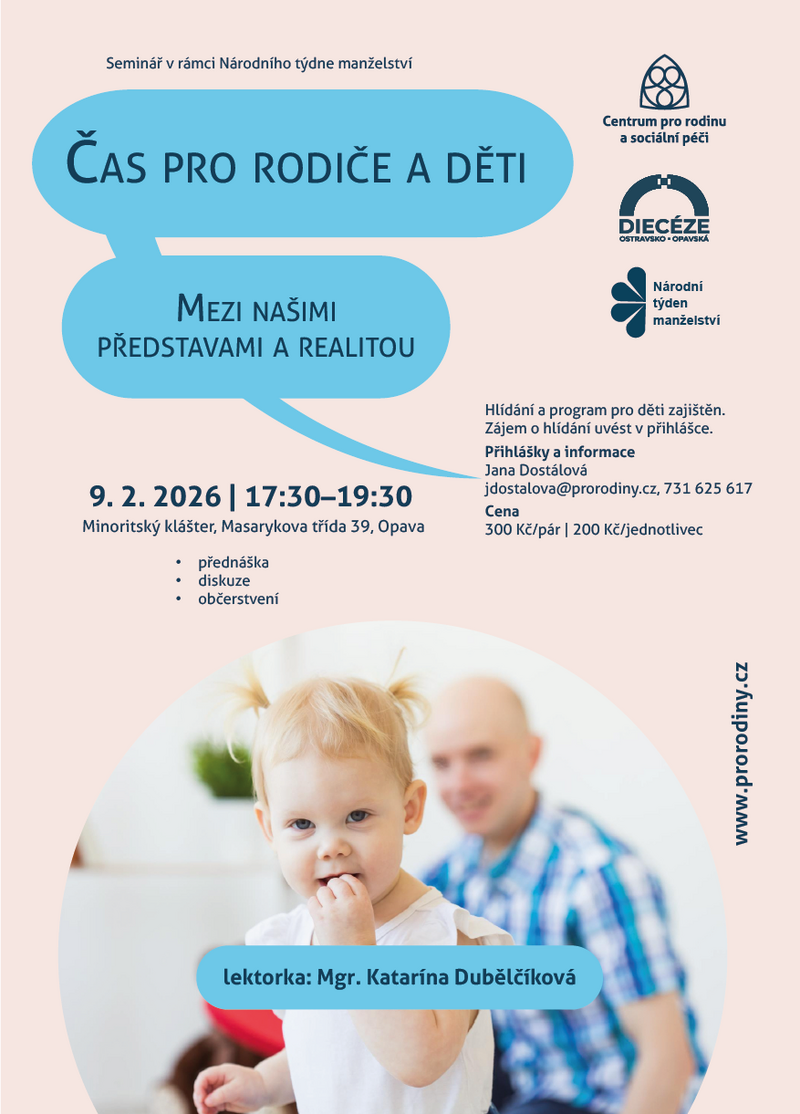 Pobočka našeho Centra v Opavě ve spolupráci s Diecézí ostravsko-opavskou zve všechny rodiče v rámci Národního týdne manželství na setkání na téma Čas pro rodiče a děti – Mezi našimi představami a realitou. Připravena bude přednáška, diskuze a občerstvení. Program pro děti i jejich hlídání je zajištěno (zájem o hlídání nutno uvést v přihlášce). Setkání se uskuteční 9. 2. 2026 od 17.30 do 19.30 hodin v minoritském klášteře v Opavě (Masarykova třída 39).