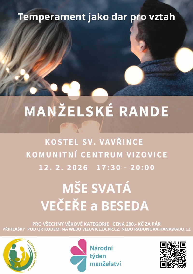 Manželské rande, úterý 12. 2. 2025 od 17:30 hod, mše sv. s obnovou manželského slibu, večeře a besedaTemperament jako dar pro vztah, cena 200,- Kč za pár.
