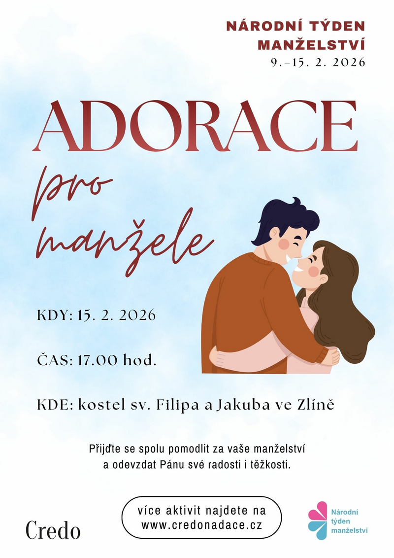 Srdečně zveme páry k modlitbě před Nejsvětější Svátostí do kostela sv. Filipa a Jakuba ve Zlíně. Adorace bude v tento den zaměřena především na manžele a jejich požehnání.